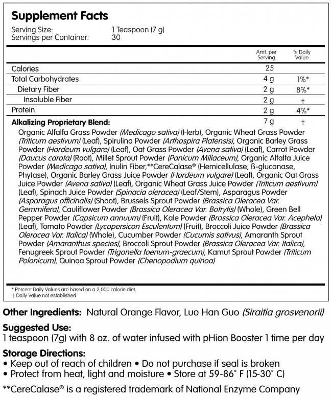pHion Alkalizing Green Superfood contains dehydrated juice powders from organic grasses. The powders are made by first juicing the greens, and then dehydrating them in low temperatures in order to preserve the enzymes.